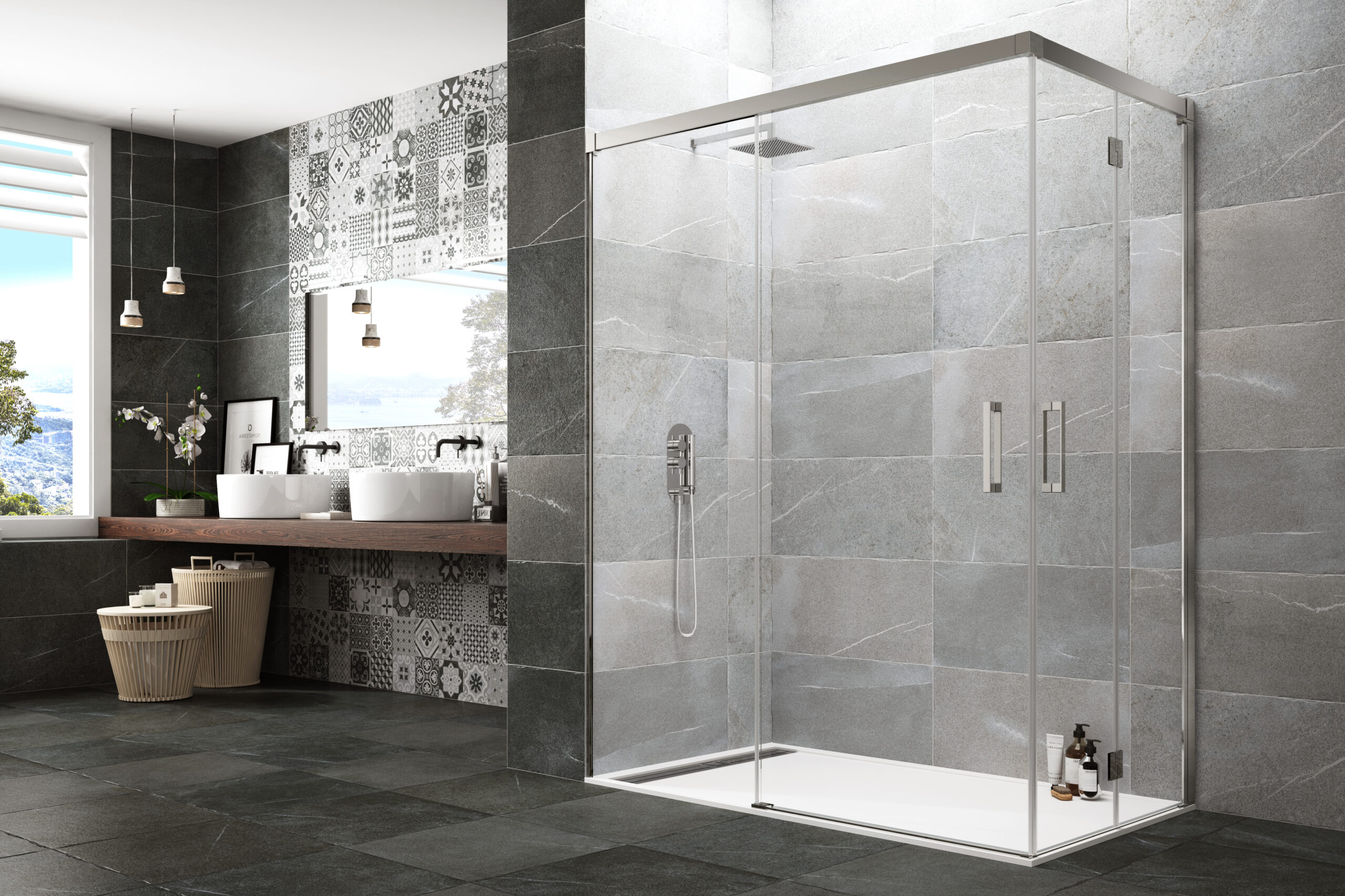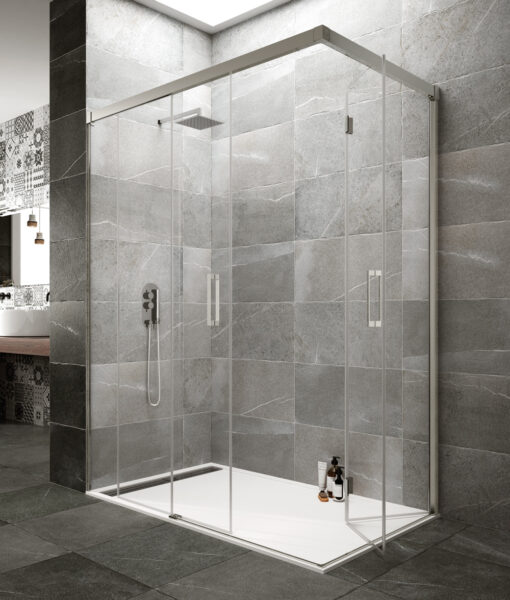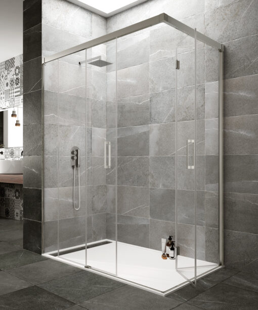 Al abrir ambas puertas, la mampara de ducha Tándem regala un hueco de entrada más amplio que otros modelos, en este caso, por el vértice del plato. Si eliges un plato moderno a ras del suelo, al no tener la mampara perfiería inferior, no habrá tropiezos y será muy cómodo entrar y salir de la ducha.