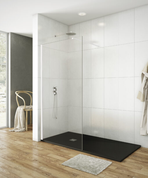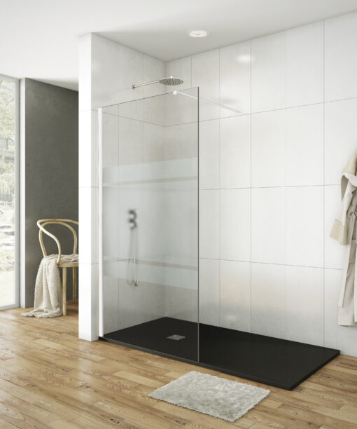 Está compuesta por un panel fijo de líneas rectas, un sistema que está de moda actualmente por su simplicidad y minimalismo, al mismo tiempo que otorga elegancia y distinción a cualquier baño.