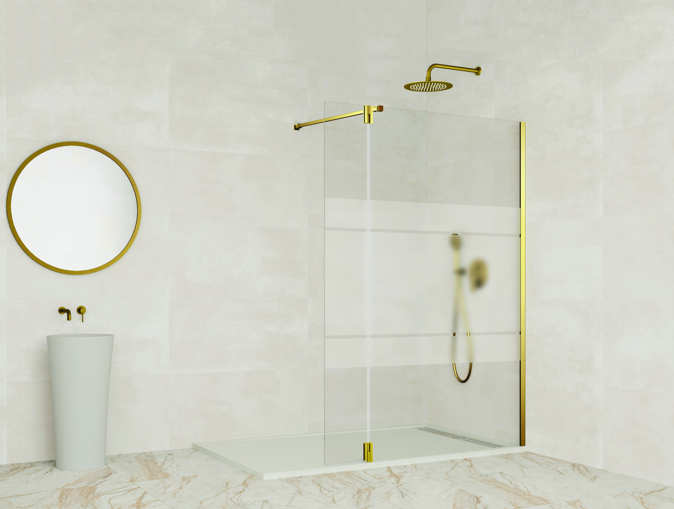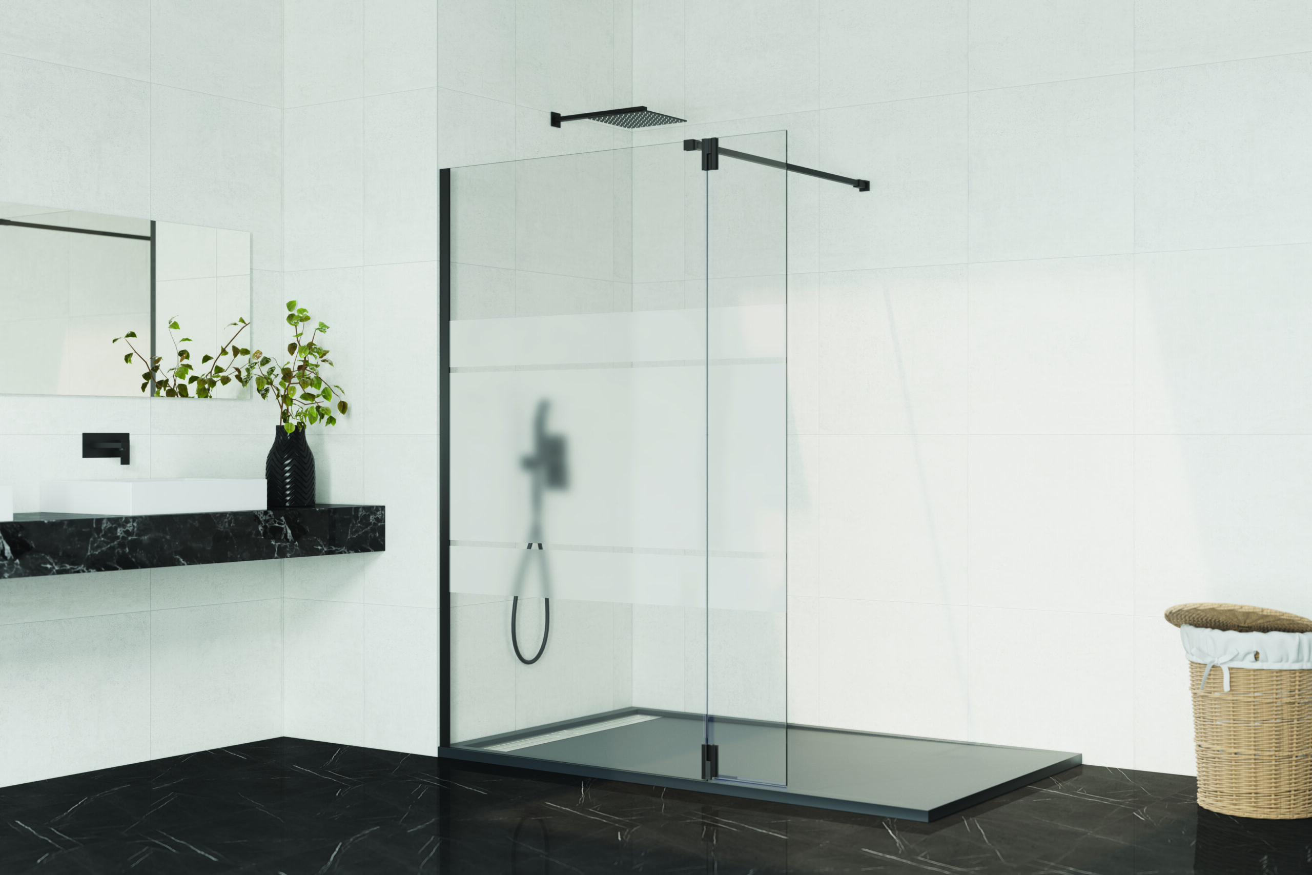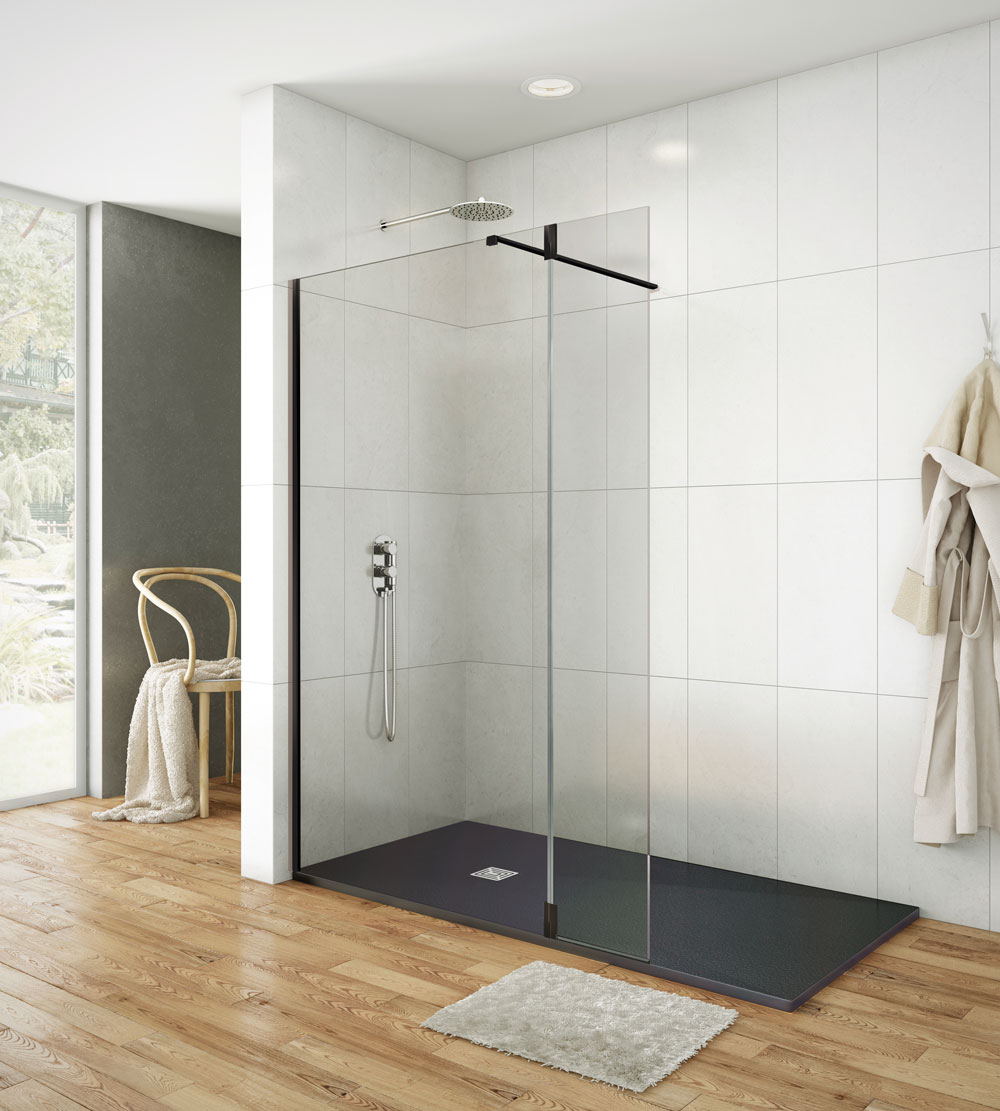 Está compuesta por un panel fijo unido a una hoja o puerta que se abate hacia dentro o hacia afuera del plato, de líneas rectas, un sistema que está de moda actualmente por su simplicidad y minimalismo, al mismo tiempo que otorga elegancia y distinción a cualquier baño.
