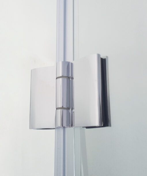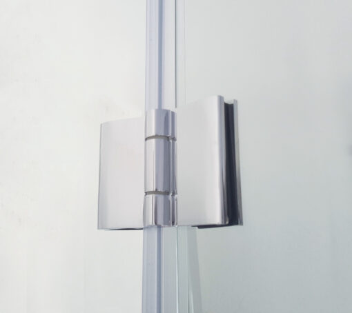 Mampara de ducha puerta doble plegble compuesto por dos cristales templados de seguridad de 6 mm, que van unidos por bisagras de latón cromado.