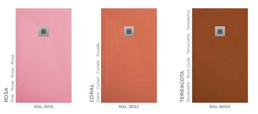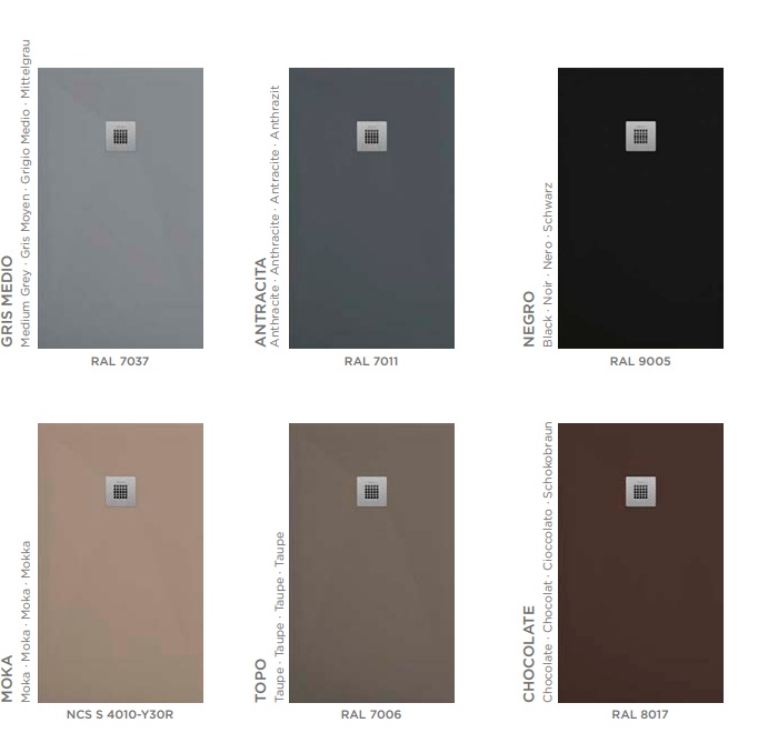 El plato de ducha a medida puedes escogerlo en 17 colores diferentes blanco, gris, gris 7035, antracita, negro, crema, arena, moka y chocolate. Para que los colores sean uniformes la fabricación del plato se realiza con una masa coloreada en los tonos del color deseado para que quede a la perfección. Fabricamos el plato en cualquier color de la carta Ral, por lo que si desea un color diferente pídanos presupuesto personalizado.
